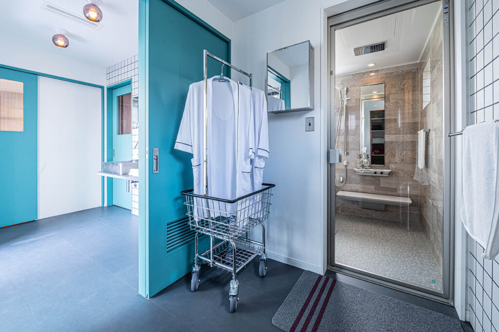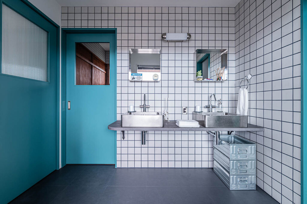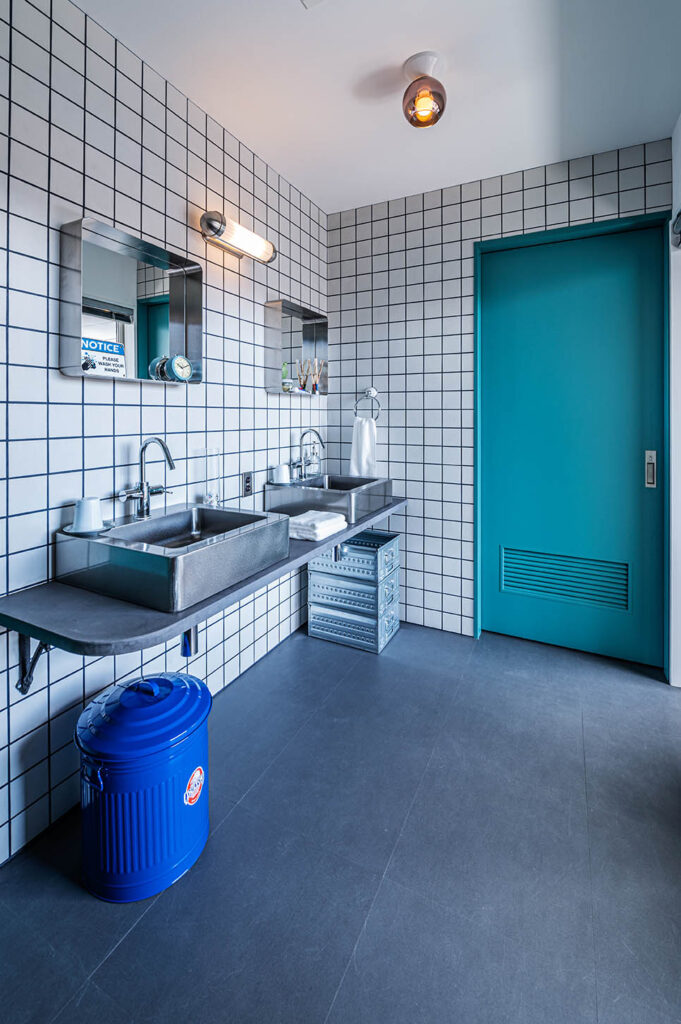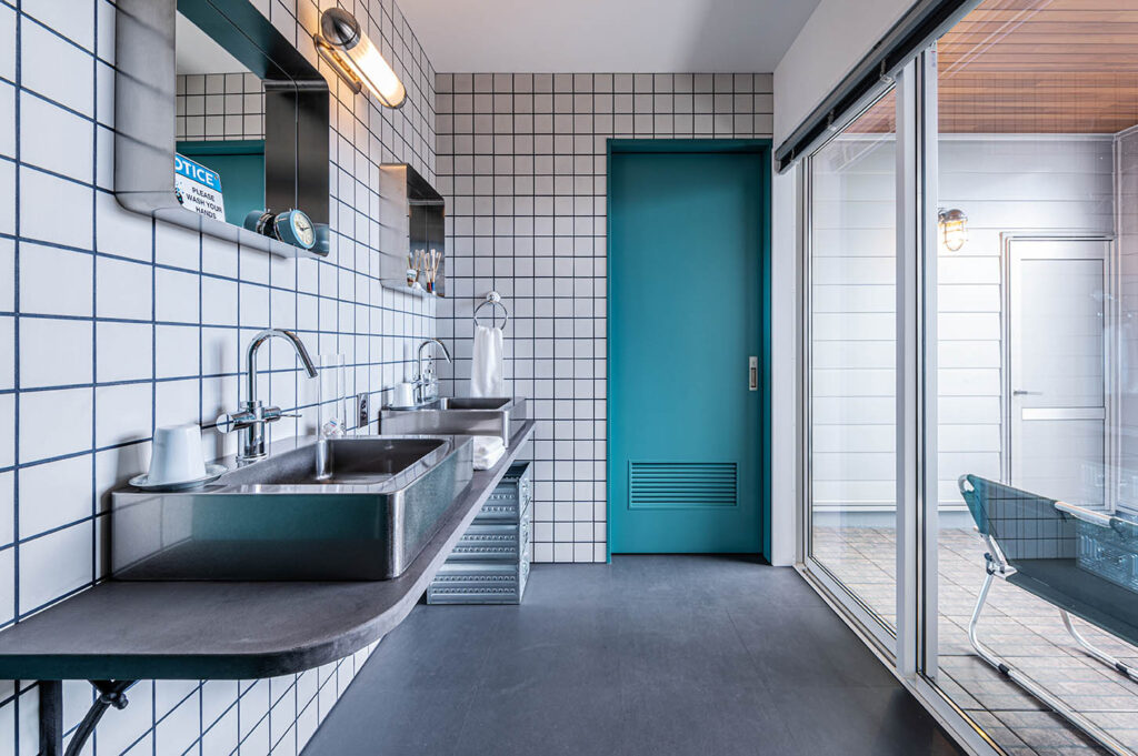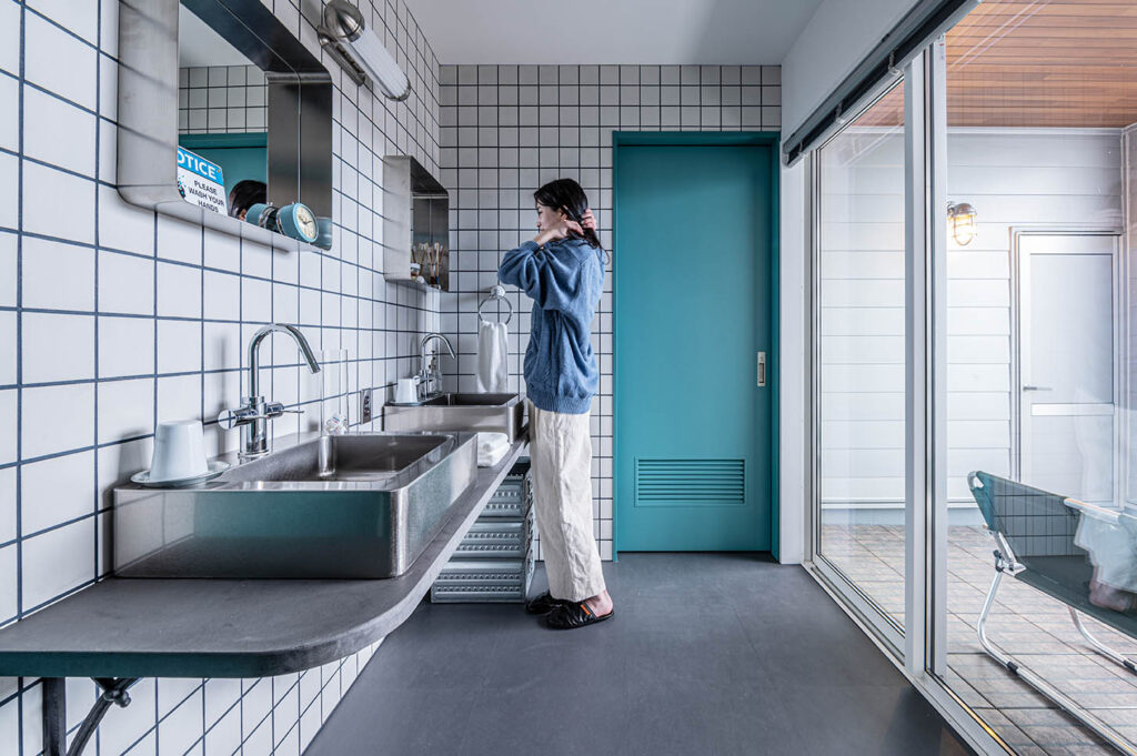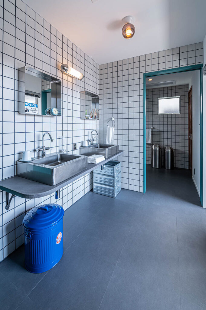 また、マットな質感のホワイトタイルと隠れた効き役「ネイビーのタイル目地」が陽の光で柔らかく表情を見せ、さらに空間を引き立てます。