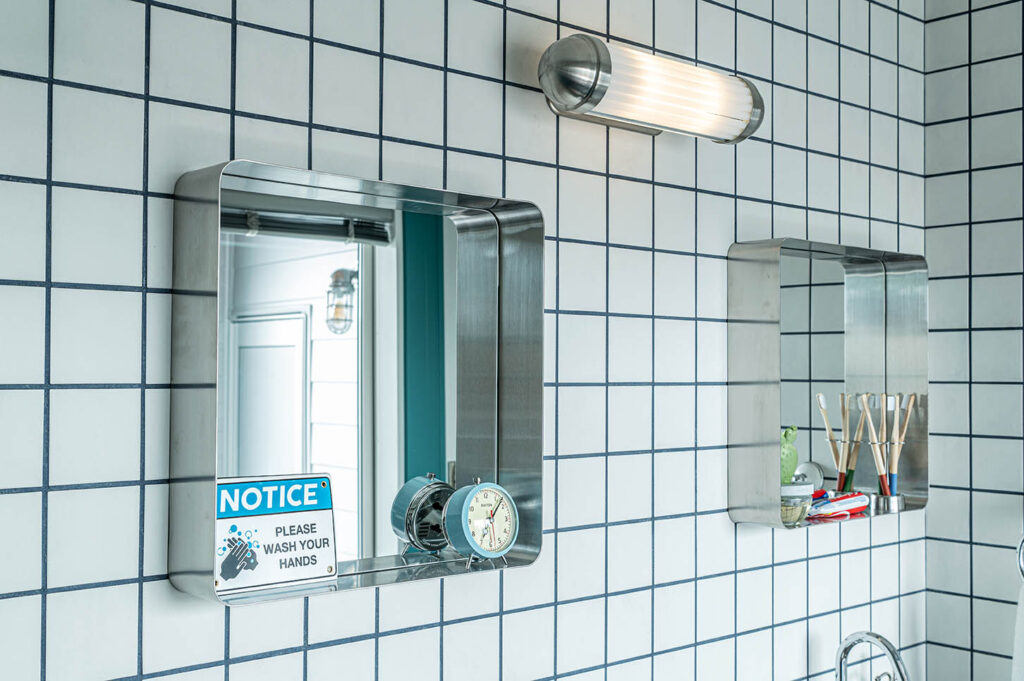 シンクやウォールミラー・ウォールランプ、タオルホルダーは全てダルトン製。